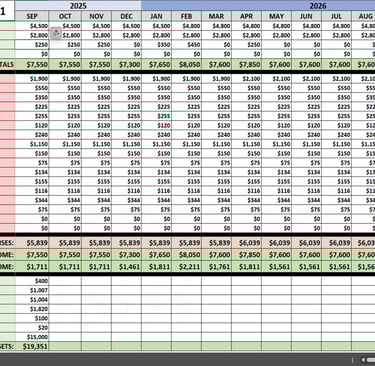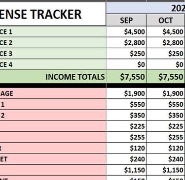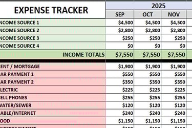 So I wasn't going to put this slide in, but back, I don't know, three weeks ago, when I first started the channel, four weeks ago, I was using this performance tracker up in the upper right corner. And I was just using it to track, you know, how I was doing in my investments each week. And that was part of the episodes once a week. And I started getting immediate questions in the comments from viewers. It's like, Well, where is that? How can we get that? I want that, and I didn't have any way, technology-wise, to distribute it, get it out there, or do whatever. So it took me a while to get it, but it's, you know, I put it out about two weeks ago, and it's pretty crazy. I think there are over 200 viewers that have their own performance tracker now, and they're doing their own tracking and simulations. And so I thought, well, I've got this Expense Tracker that I've been using. And so I decided I'll put that out there as well. And if it's something people can use, great. If not, that's fine. So starting at the top, just a quick overview. You've got income sources. You can go in and change those to any, you know, whatever your job is, or your income sources, you can type in; you can customize that to whatever you want. I just put in sample bills that you could have every month. You can change all of those out to anything you want, and then account balances: checking, savings, other accounts, investment accounts; you can type whatever you want in there. And then at the top, the green and red rows do all the totaling for you. So the white rows, or the white columns, like say, for September, you put in that check $4,500 and another source of income, $2,800; it totals up that income for you all the way across. And we use this a lot for forecasting expenses that are not every month. There are some stuff that comes due every three months or every six months, or once a year. And so we forecast out as far as we can so we don't get surprised with a $200 HOA bill or a doctor's visit that we know is going to be a couple hundred bucks and it's in three months. So we just kind of use it to forecast a little bit so we don't get surprised, you know, down the road. So again, all the totals are made for you. You just enter the amounts in the white columns, and everything's there. We use it. I'm in here probably at least a couple of times a day. My wife is in here. She'll go in and update or change different expenses. And it's not like it's a big chore. It just helps us kind of keep an eye on where our money's at, how much is coming in, and how much is going out. Do we have enough allocated for different expenses coming up in a month or two? So it's just, it's very useful for us. So I just wanted to share that, and it's out there; there's a link in my description for this video, and then on my channel homepage is also a link to this Income and Expense Tracker. If you want it, great. If not, that's okay too.